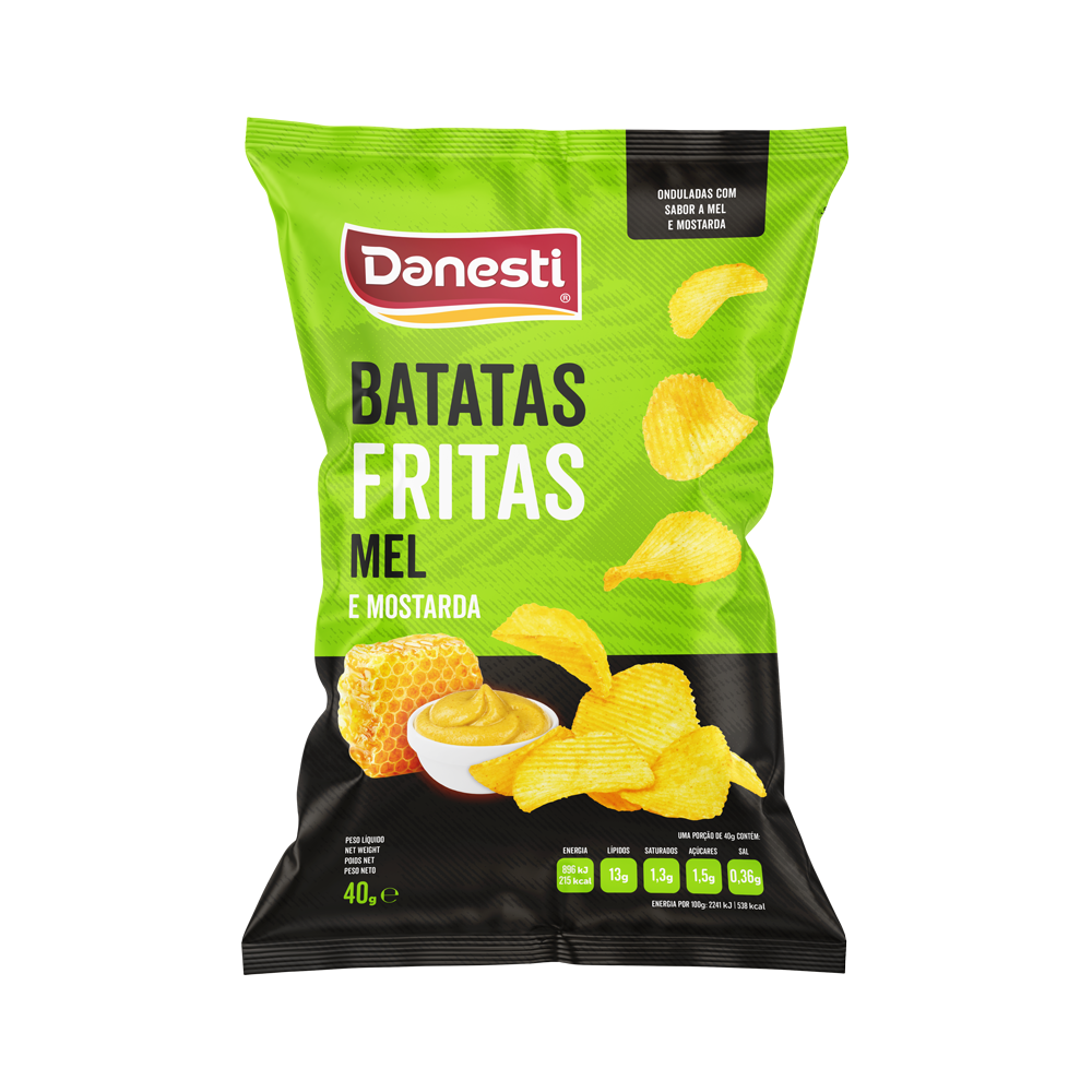 Batatas Fritas onduladas de sabor a Mel e Mostarda! A mistura ideal da suavidade do mel com o ligeiro toque picante da mostarda.