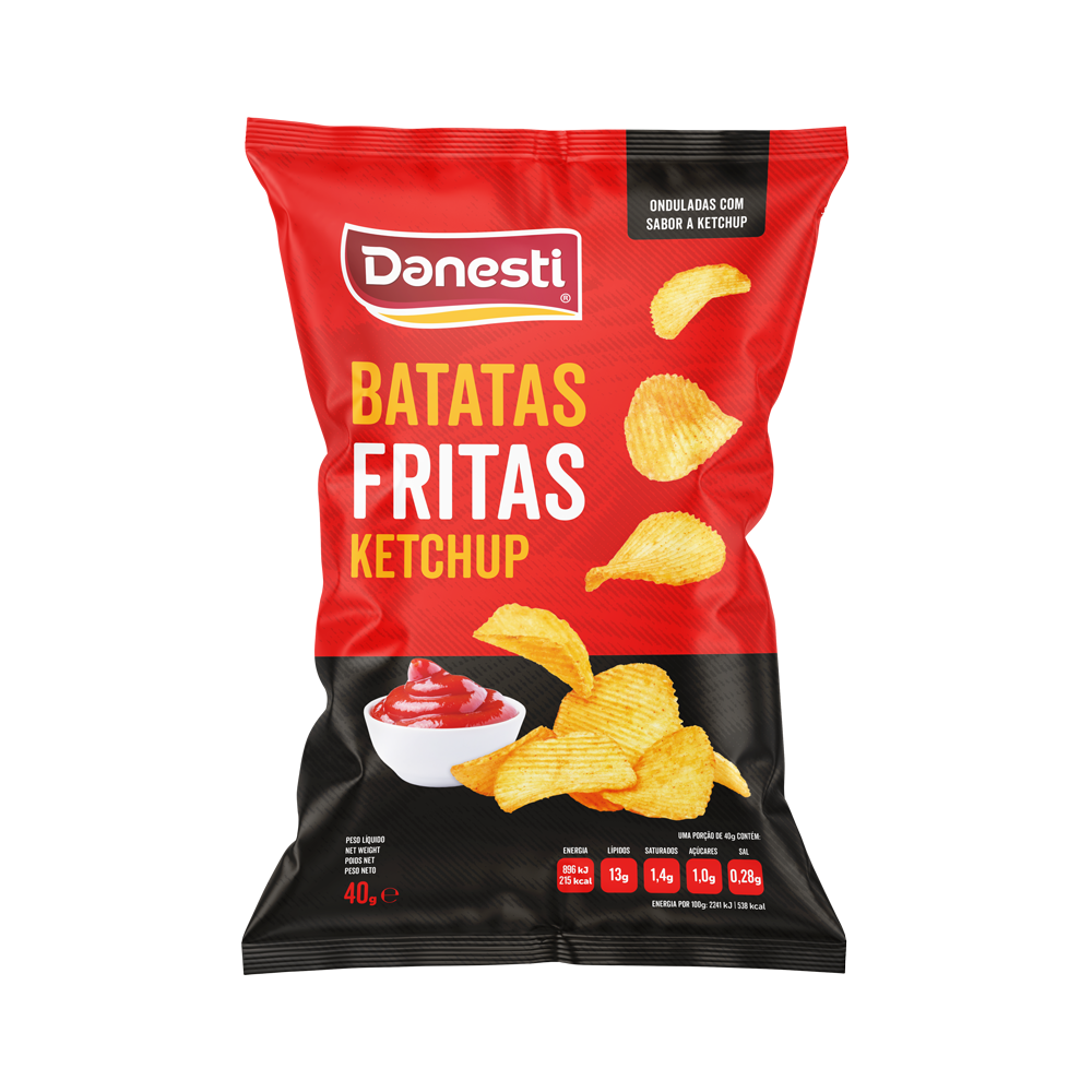 Ingredientes | Batatas (60,5%) [Origem: UE], óleo de girassol com alto teor em ácido oleico (33%), preparado com sabor a ketchup (6,5%) [açúcar branco, vinagre de álcool em pó, tomate em pó, sal, maltodextrina de batata, acidificantes (ácido málico, ácido cítrico), levedura em pó, cebola em pó, extrato de especiarias, aroma]. |