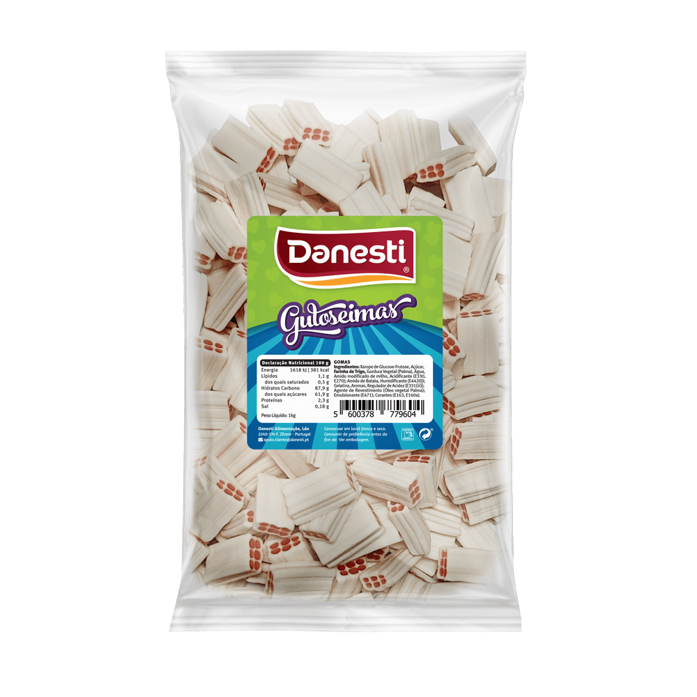 | Ingredientes | Xarope de glucose-frutose, açúcar, farinha de trigo, gordura vegetal (palma), água, amido modificado de milho , acidificantes: E330,E270; amido de batata, humidificante E4420, gelatina , aromas, regulador de acidez E331(iii), agente de revestimento (óleo vegetal palma); emulsionante:E471; corantes: E163, E160a. |